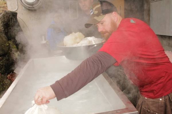 Back through the kitchen, out a side access door and enshrouded in thick, billowing clouds of steam stood Dave Lambert, owner of the Slippery Pig. Beside him was Erik Swanson, on hand to assist in the methodical cooking of the cured and reconstituted fish, which had been soaked in water for several days. The team passed net-like bags filled with cod, meticulously carved into smaller, manageable chunks for cooking.