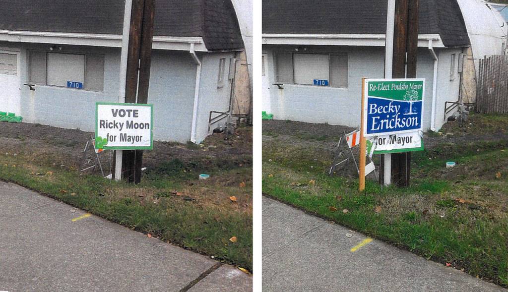 He showed photos of campaign signs for the incumbent, Becky Erickson, that had been placed in front of his (the Herald left messages on her cell phone Oct. 3 and 6). He showed other photos that showed his signs laying on the ground.