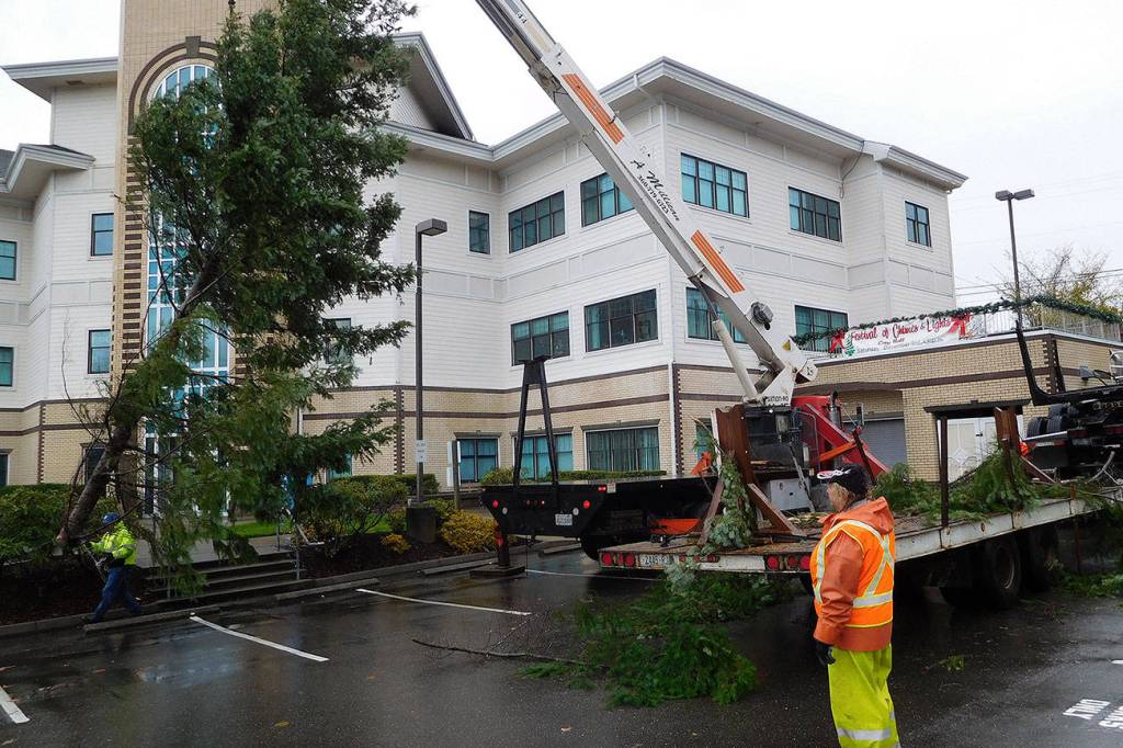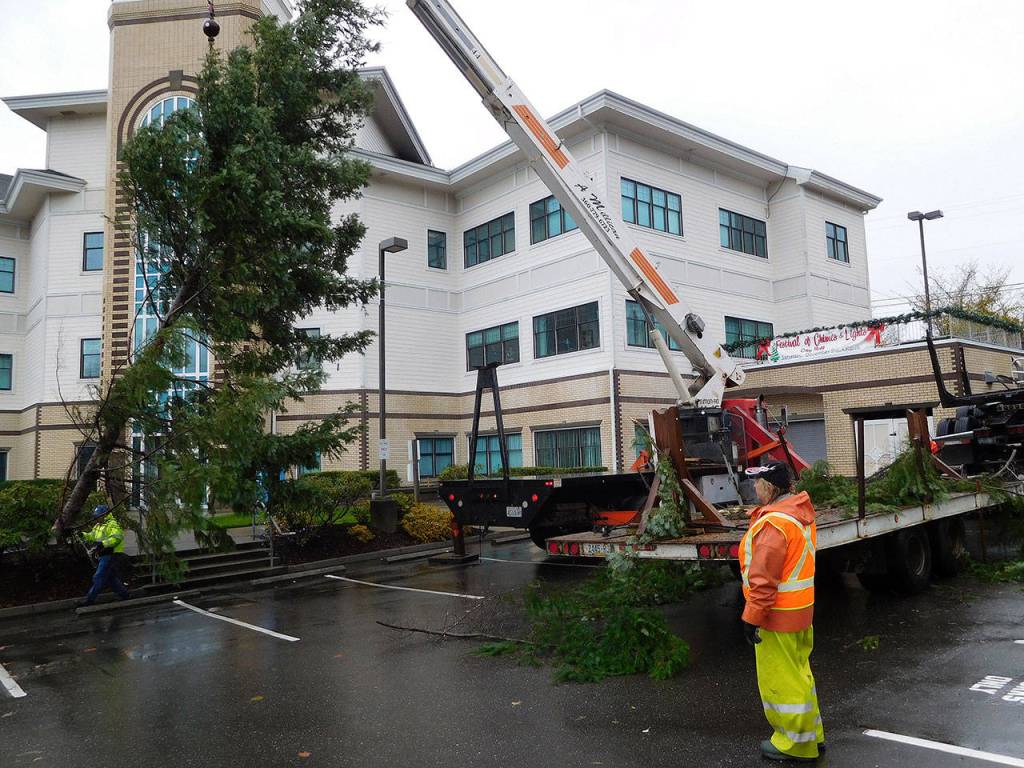 The tree was lifted off a flatbed truck Nov. 15 and moved to the customary spot next to City Hall’s entrance off Bay Street, where City of Port Orchard employee Bill Thiele and his crew secured it in place.
