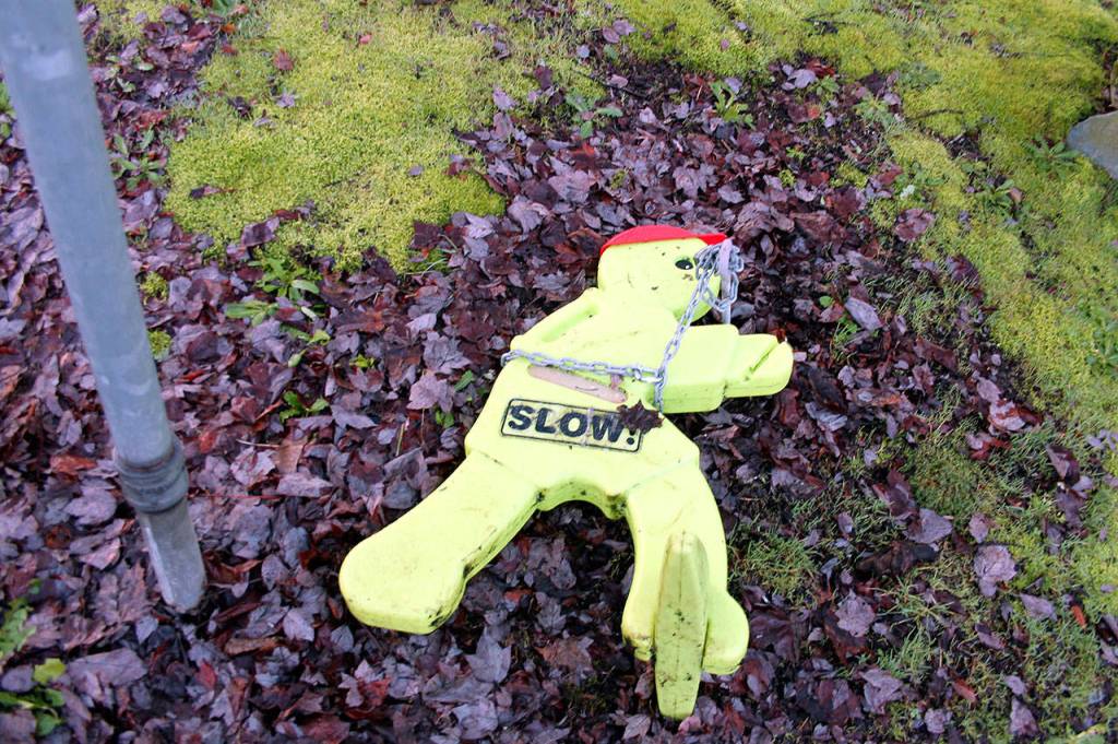 At 7:30 a.m. Jan. 15, this crosswalk signage near the crosswalk at that intersection was not visible to motorists because it was on its side and chained to a bolt in the ground. On one side of the street, a holder for pedestrian flags was empty.