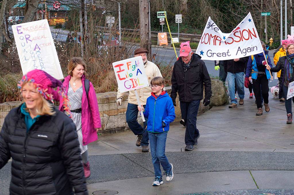 Marchers from Bainbridge and the Kitsap Peninsula, many of them wearing pink hats and carrying signs, walked through Winslow toward the ferry terminal Jan. 20 to set sail for Seattle and join the ranks of the second Women’s March.