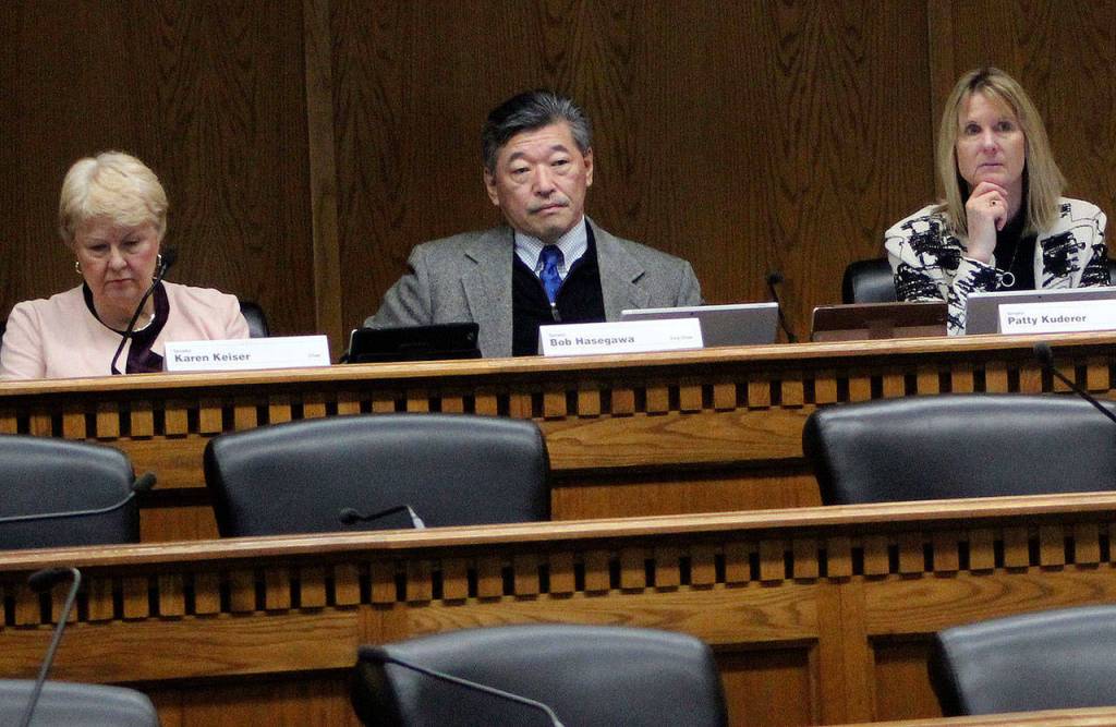 State Senate Labor and Commercial Committee members Sen. Karen Keiser, D-Kent, Sen. Bob Hasegawa, D-Beacon Hill and Sen. Patty Kuderer, D-Bellevue, listen to a debate about workplace bullying and sexual harassment in Olympia. (Taylor McAvoy | WNPA Olympia News Bureau)
