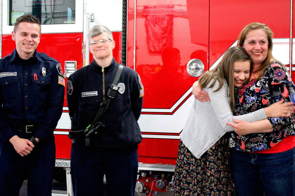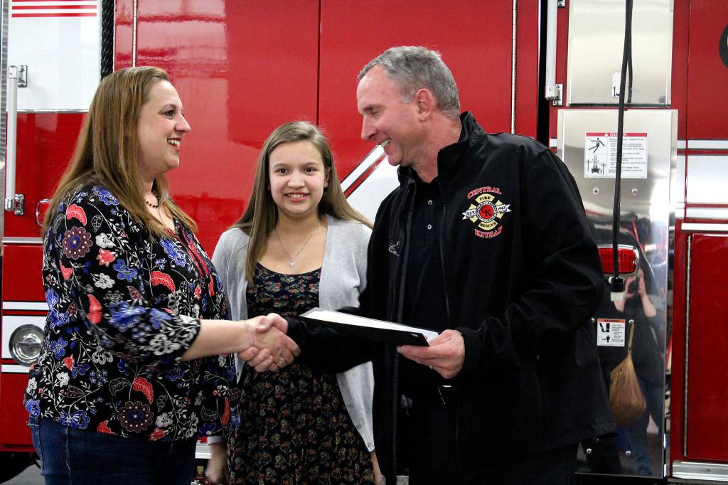 The crew who responded to the 911 call, the Gutierrez family and friends gathered at a CKFR station March 27 to recognize Elyza, now 13, for her efforts. Elyza received a firefighter pin and a Citizen Life Saving Award.