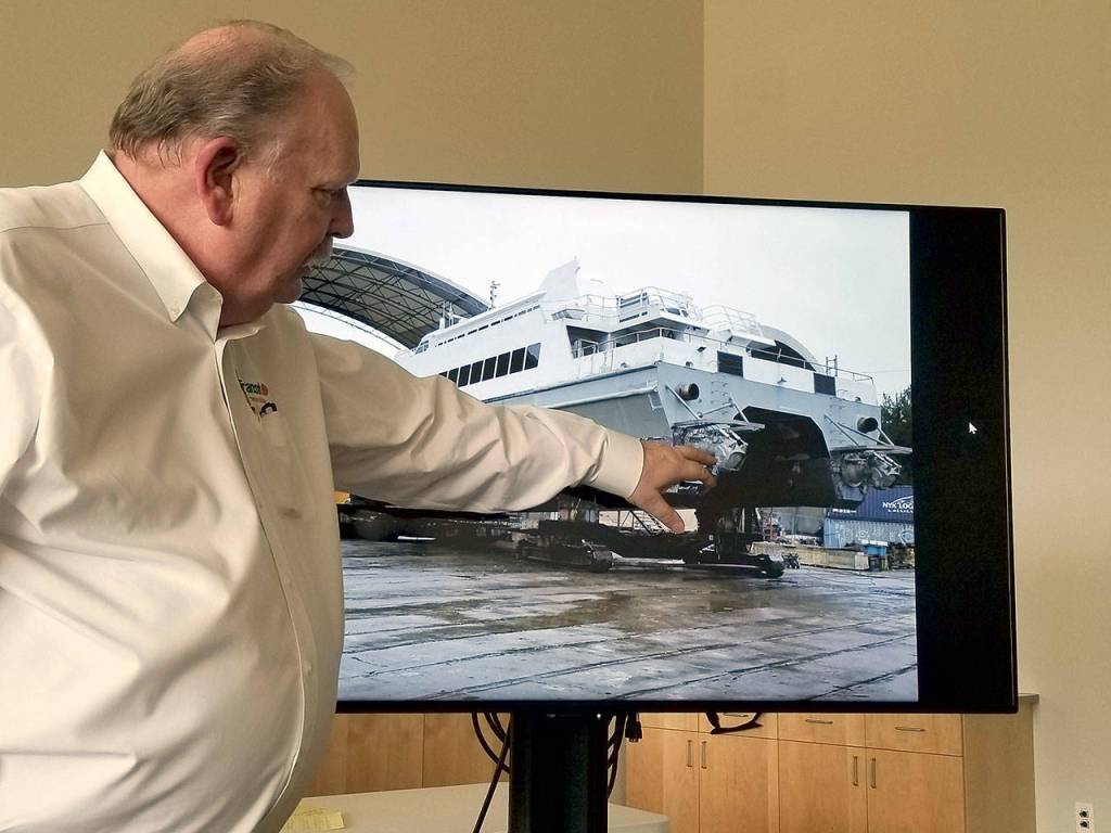 As for the refurbishment of the vessel, Clauson offered a couple photos of the ferry as it undergoes a facelift in Whidbey Island at the hands of Nichols Brothers Boat Builders. The interior showed a barren space. “They’ve taken out all the carpets, they’ve taken out all the seats. Basically we’re having them completely refurbish the entire interior, so it’s going to be a brand new boat.”