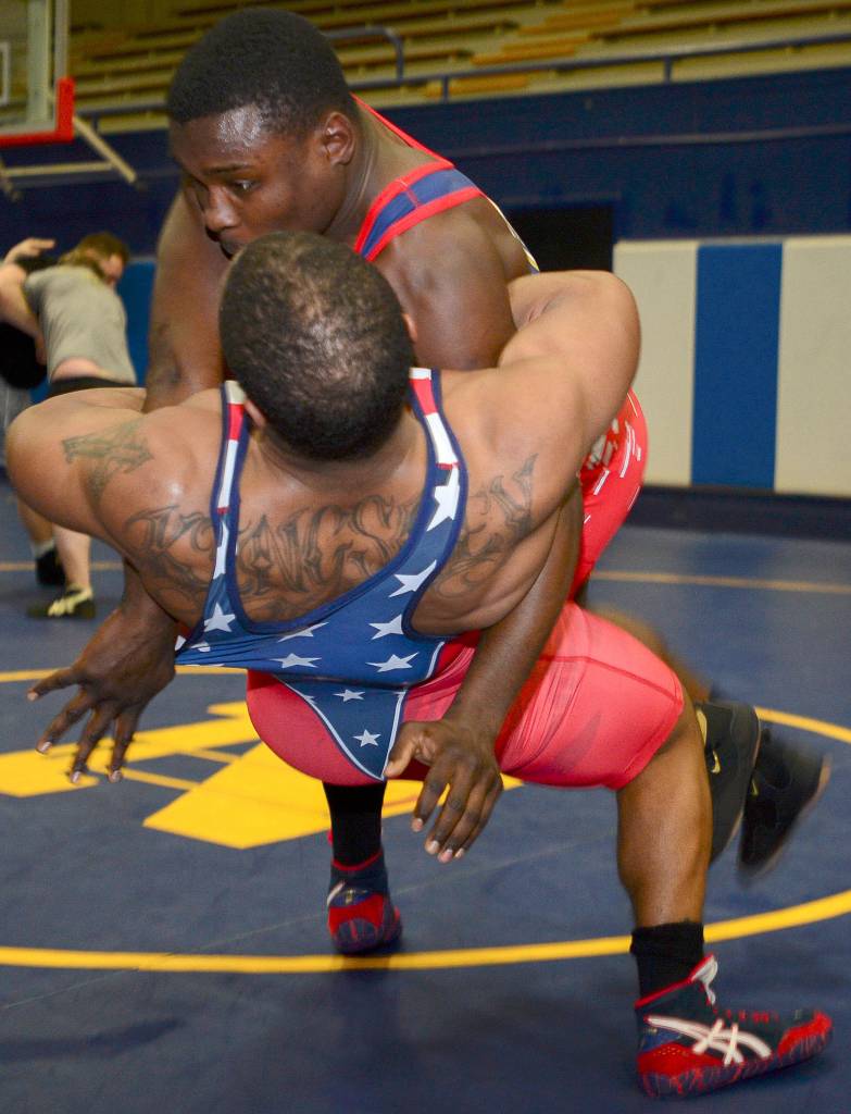 BREMERTON — Sweat drips off foreheads onto the mat just as the buzzer sounds. Tired and sore, two sailors mentally prepare themselves for the task at hand. Their eyes are focused with clear minds ready to begin the next drill. The whistle blows. They wrestle like angry brothers trying to settle the age-old question of who is better.