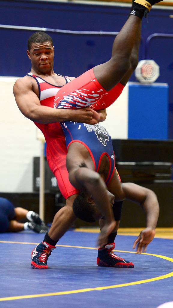 Interior Communications Electrician 2nd Class Austin Craig from Monroe, North Carolina, and Culinary Specialist Seaman Derekston Williams from Macomb, Georgia, both assigned to the aircraft carrier USS Nimitz (CVN 68), represent the ship as members of the All-Navy Wrestling Team, and one day hope to represent the United States in the Olympics.
