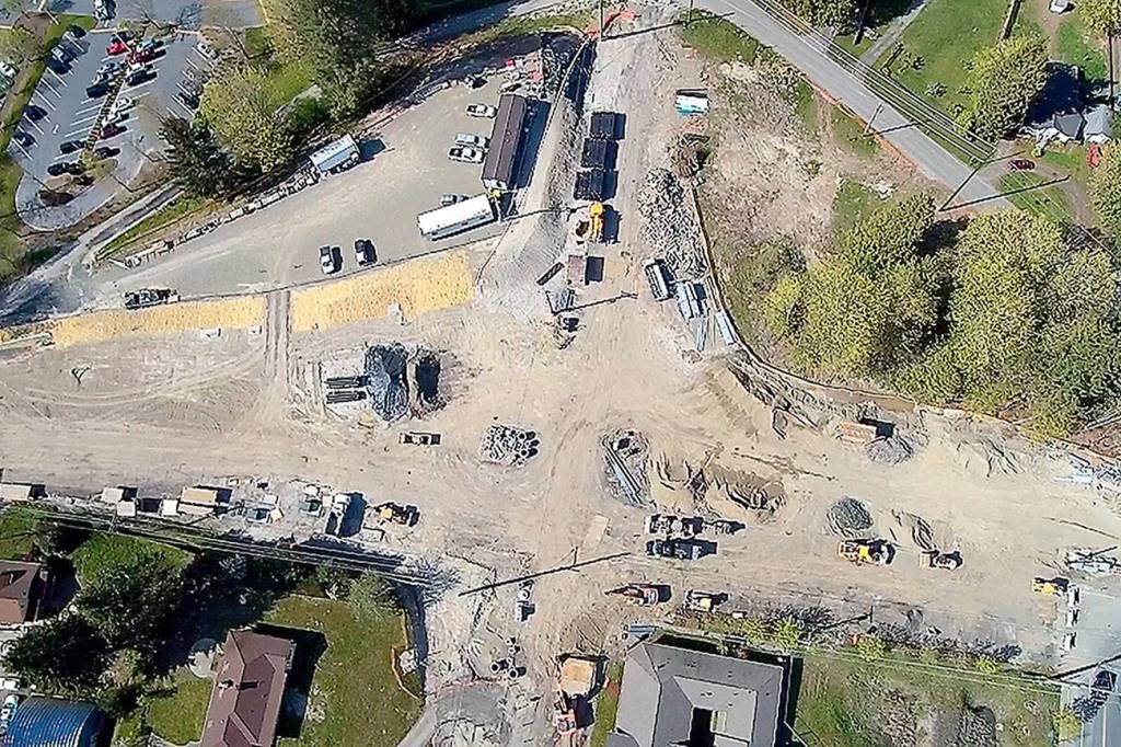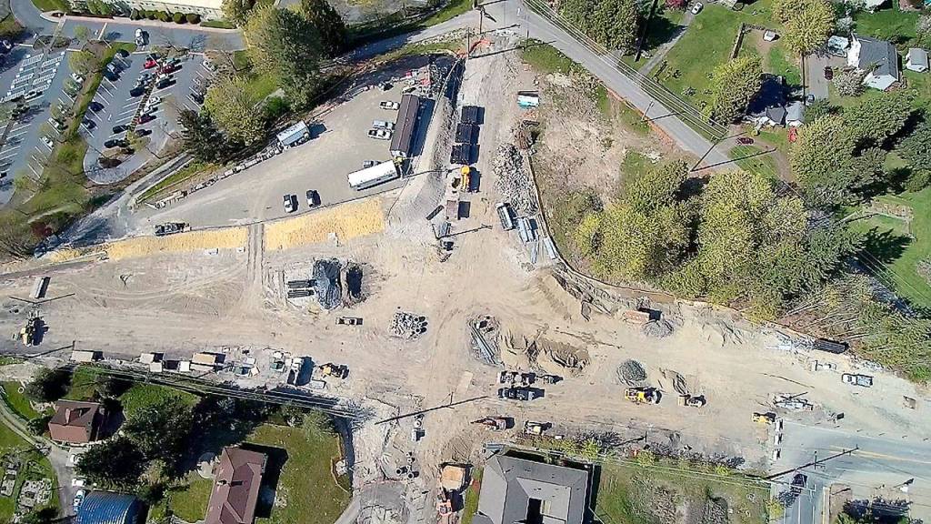As shown in this aerial photo, the outline of the planned roundabout at the intersection of Tremont and Pottery Avenue is beginning to take shape after months of utility trenching and construction of stormwater runoff ponds. Another roundabout is planned for the intersection of Tremont and South Kitsap Boulevard, near the interchange with SR 16.