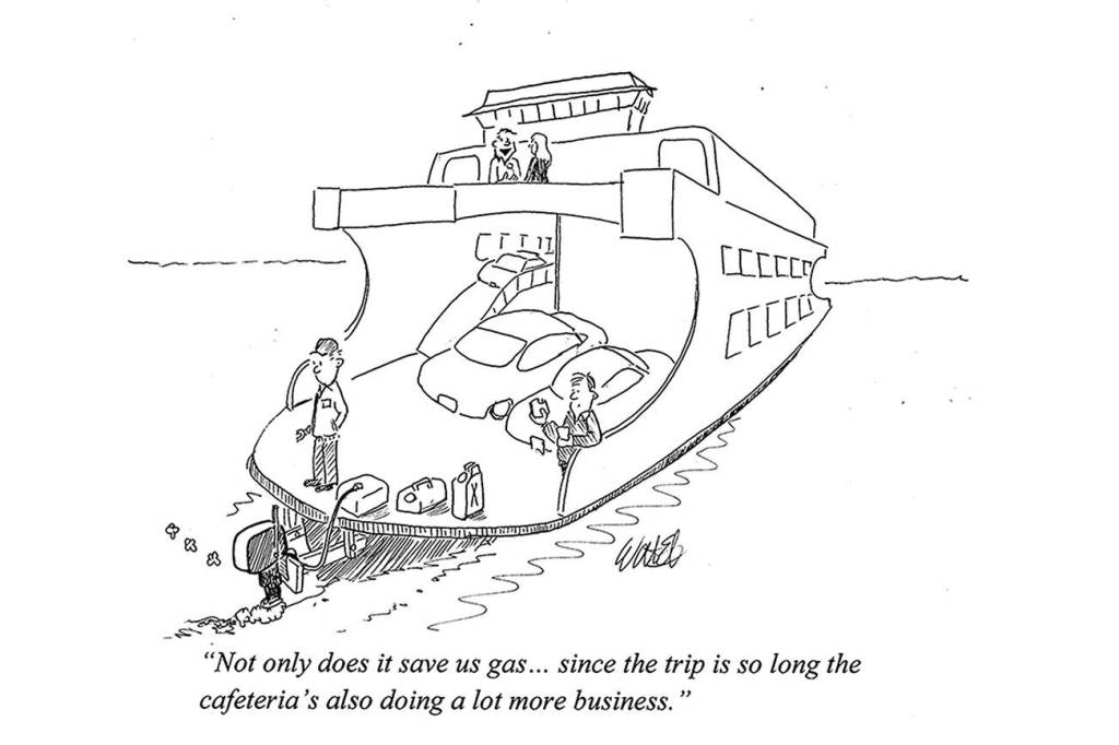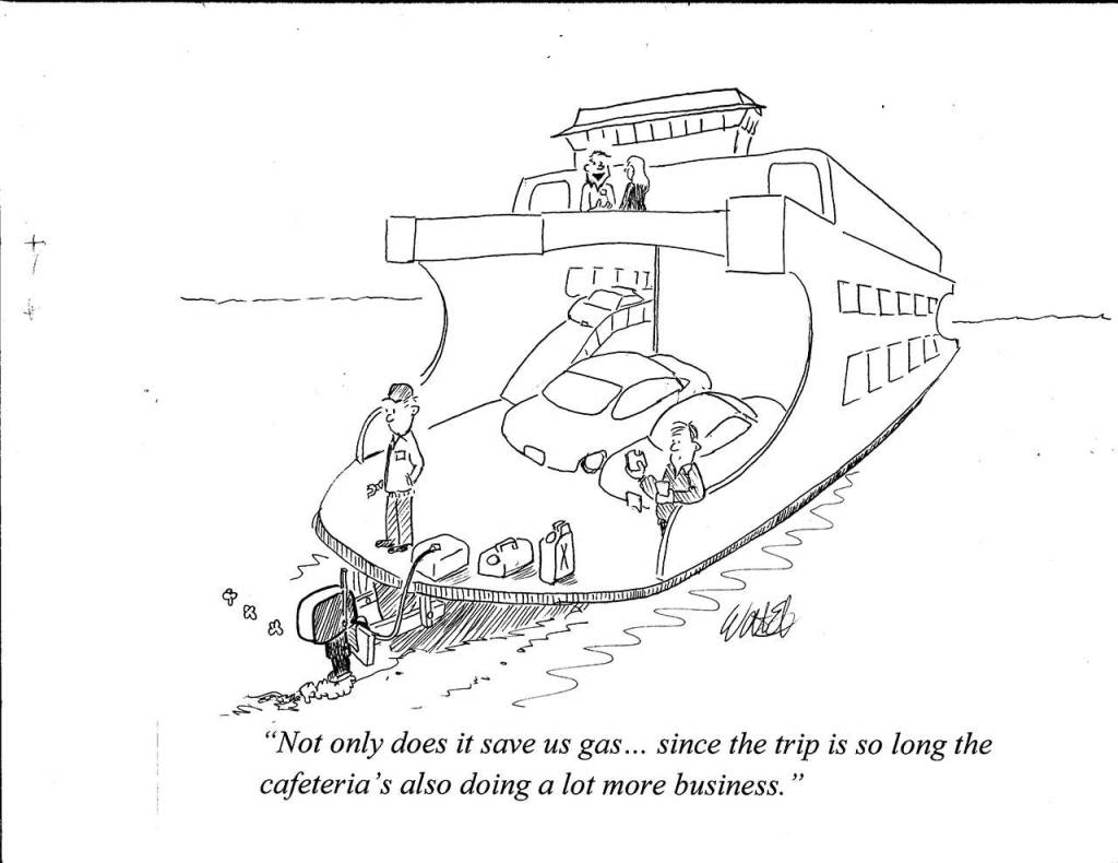 The cartoon refers to a surprise decree last month that the ferries are going to save gas by slowing down. WSF has proclaimed that slowing from 20 knots to 18 knots would save a whopping 50 gallons per sailing. If only that were true. Even if Capt. Kirk of starship Puyallup called Scotty for warp drive he wouldn’t get much over 18 knots … not even with fair winds and a following sea.