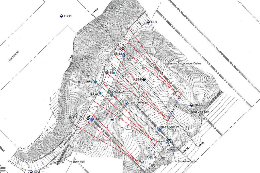 A pair of passive groundwater drains would connect to each pit. A header system would then collect the water from these mid-slope dewatering pits and pipe it down to a shoreline outfall. The report noted, however, that this half-slope dewatering system would not affect the landslide’s stability. The initial cost of this alternative was estimated at $550,000.