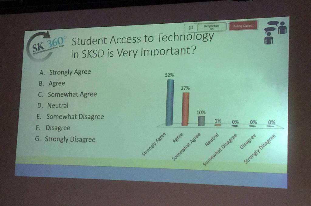 Following the breakout and reporting sessions, Brandsma asked the audience to share their opinions of a series of questions on preferences for facilities bond packages, whether security in the schools is a top concern, how trusted the school district is in the community and other related issues.
