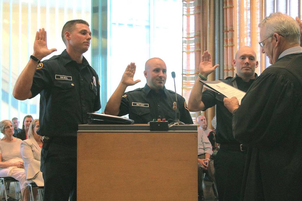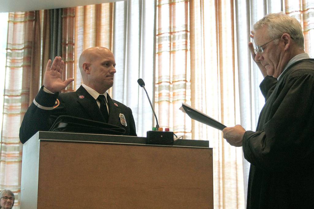 Battalion Chief Brad Richard was also scheduled to be sworn in, but he had responded to the Wednesday evening brush fire at the Bremerton watershed. He was promoted to his position in February.