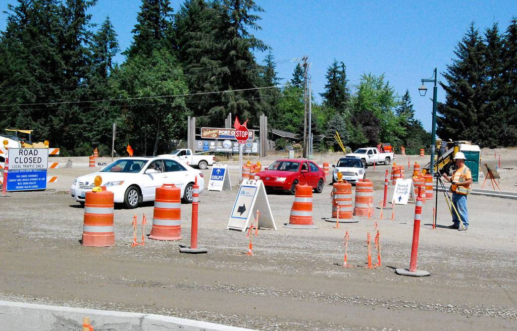 Since the middle of June, commuters heading to SR 16 and McCormick Woods from downtown Port Orchard via Tremont are traveling through this intersection that’s been stripped of its asphalt and usual traffic signal, leaving traffic flaggers during the day to signal drivers along the gravel and dirt stretch of roadway. At night, a four-way stop sign controls the pace of traffic.