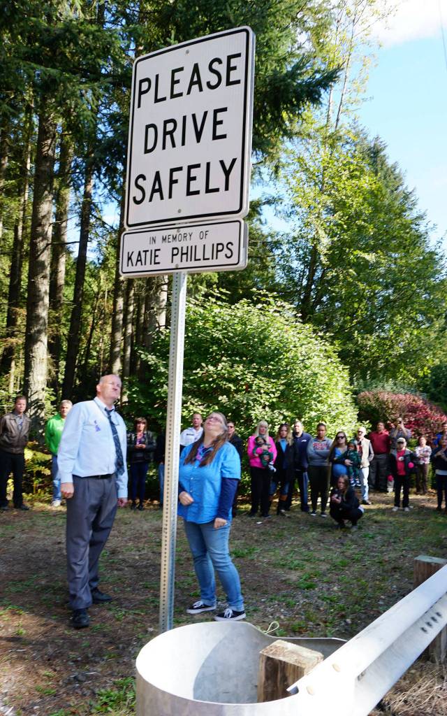 On this day that Olwell called “a bittersweet moment,” those who loved and appreciated their lively friend would later watch the unveiling of a cautionary road sign at the location where Phillips died in March. Following the brief toll booth ceremony, the group traveled west on Sedgwick Road, also known as State Route 160, to watch the dedication of a “Please Drive Safely — In Memory of Katie Phillips” sign at the spot of the hit-and-run incident.