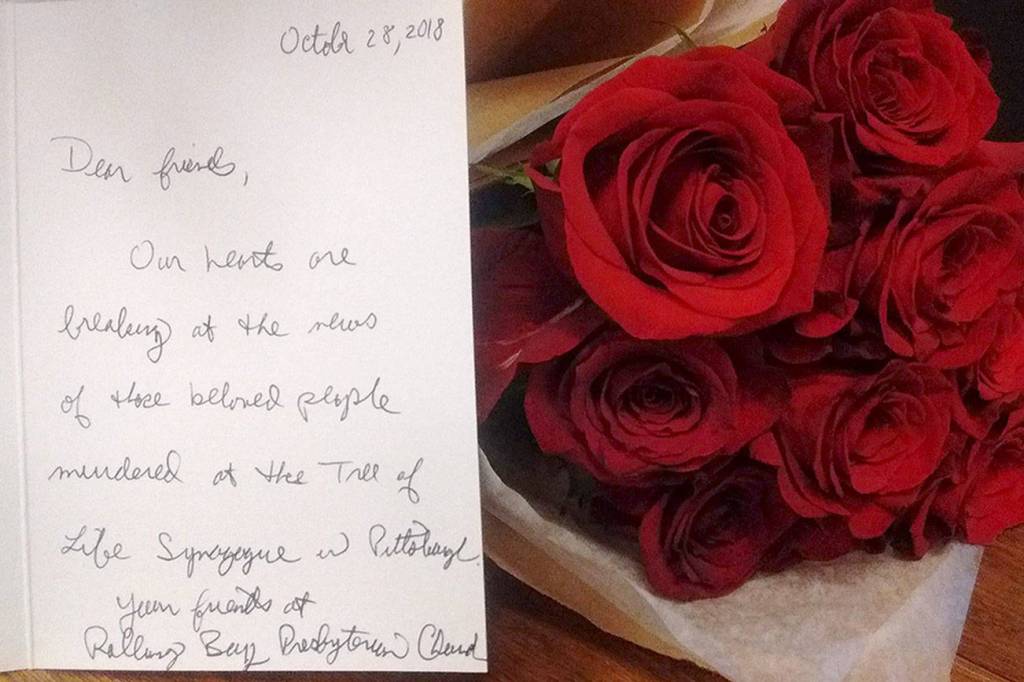 Another note included a bouquet of white roses, left by a couple who lives near the synagogue.
