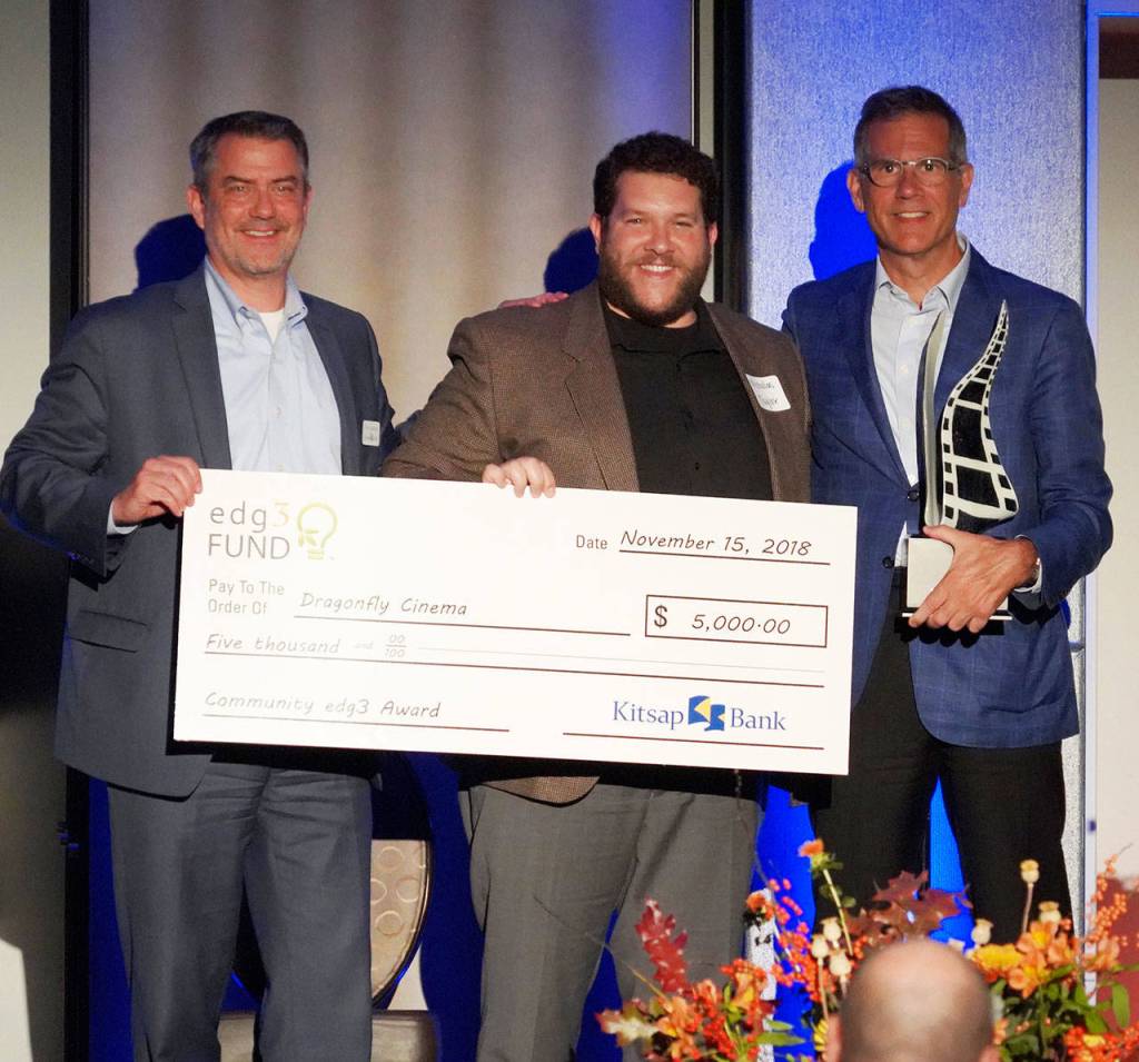 Dragonfly Cinema, a Port Orchard independent movie theater, was presented the Community edg3 Award and a $5,000 cash prize. The award goes to a business from among the 15 semifinalists that, in the judges’ opinion, best embodies the spirit of community, based on their submitted application and video.
