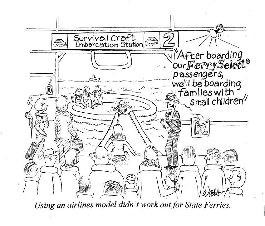The cartoon is my feeble attempt at humor. We have great, helpful ferry crews. I and your Ferry Advisory committee appreciate their cooperation and attitude.
