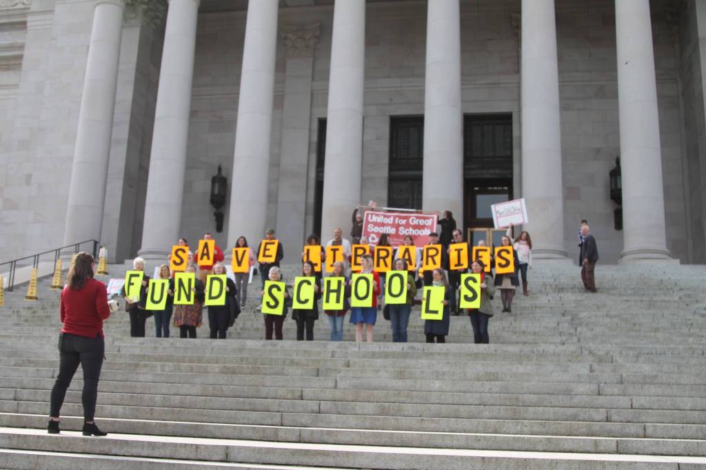Seattle Public Schools librarians gathered on the steps of the Capitol building April 2 to protest the lack of funding for schools and their libraries.