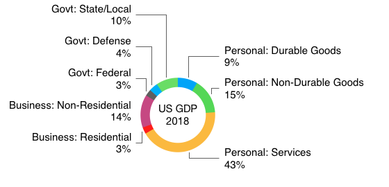 The most important thing for you to know about the U.S. GDP is that for decades it’s been dominated by personal consumption expenditures. In 2018 personal spending was 69 percent of the total GDP. Business investment and government spending each contribute about 17 percent and net exports were a negative 5 percent.