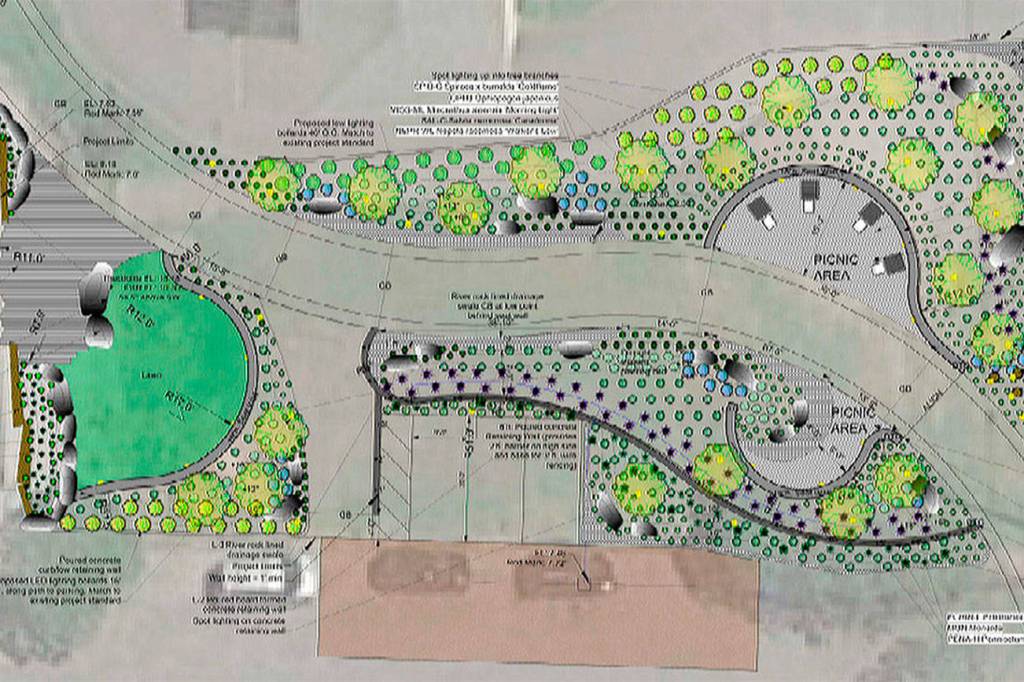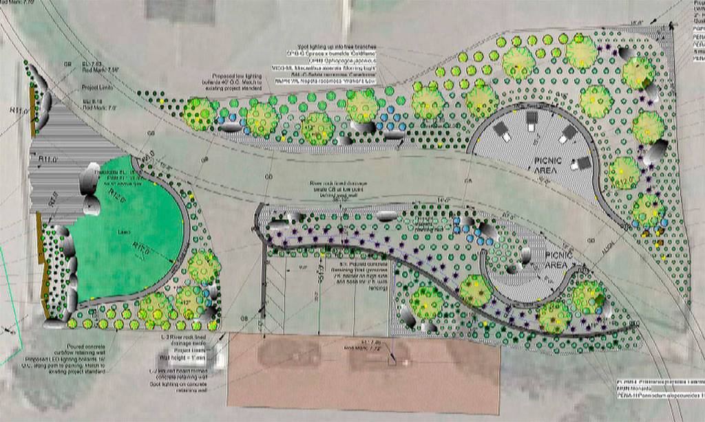 The park is between the Marlee Apartments and the Comfort Inn and features beach access, terraced seat walls, picnic areas and a kayak launch point.