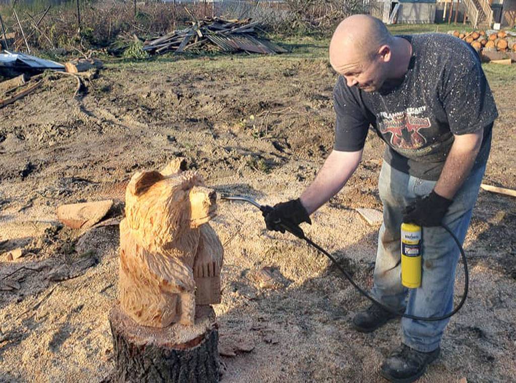 As the tornado ripped its way across an empty field, it toppled a large evergreen tree that was about two feet in diameter. Some of that tree became bears the carvers had created. For some unknown reason, one of the property owners pulled the 14-foot stump upright in the same spot where the majestic tree once towered over the empty field.