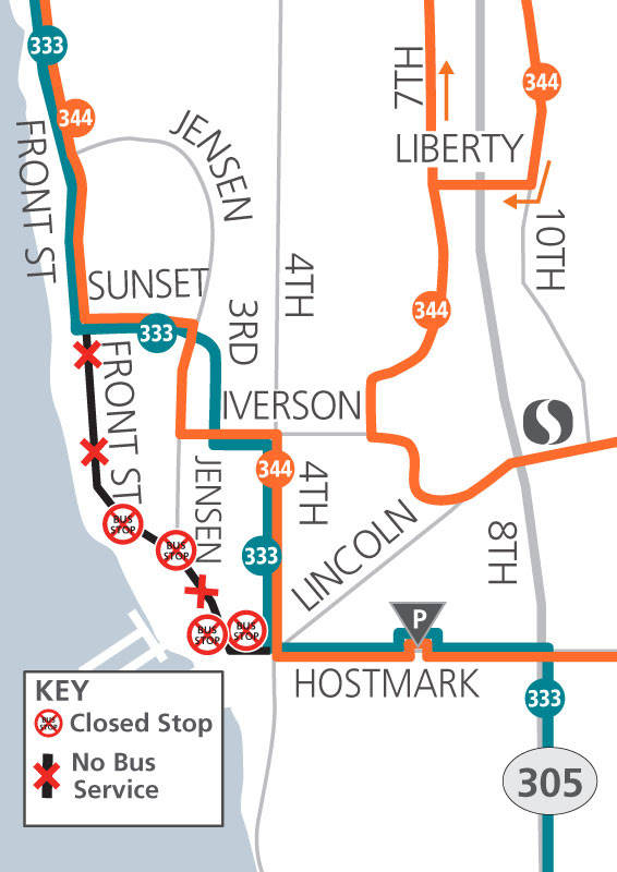 To help keep Routes 333–Silverdale/Bainbridge and 344–Poulsbo Central on schedule, the section between Hostmark street and Sunset street will not be served.