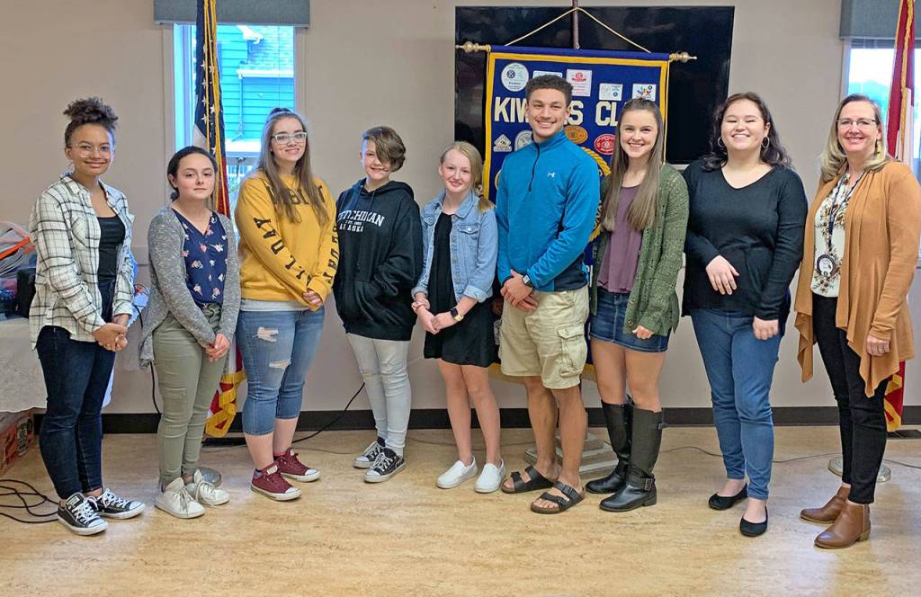 Left to right: Renee Wallace, Shae Dean, Emma Wilcox, Samantha Washburn, Reese Wilson, Deyondre Davis, Sara Reidy, Bella Walker and Kiwanis Club President Carroll Olson. (South Kitsap School District photo)