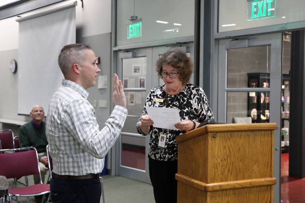 Mike Desmond was sworn in as a member of the North Kitsap School District by Poulsbo Mayor Becky Erickson on Dec. 12, 2019.