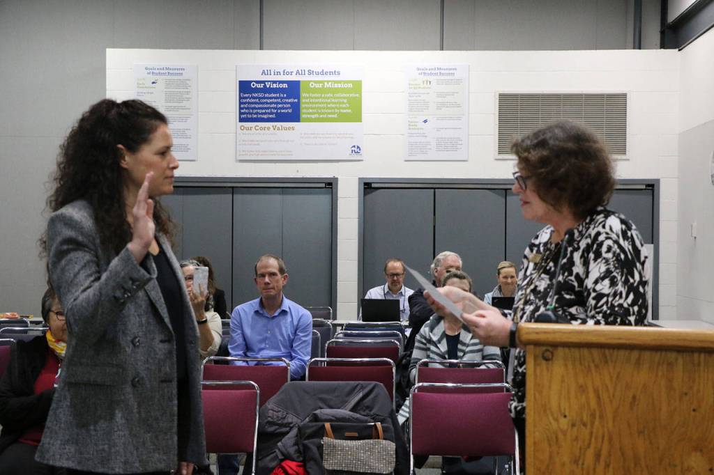 Breanne Martinez was sworn in as a member of the North Kitsap School District by Poulsbo Mayor Becky Erickson on Dec. 12, 2019.