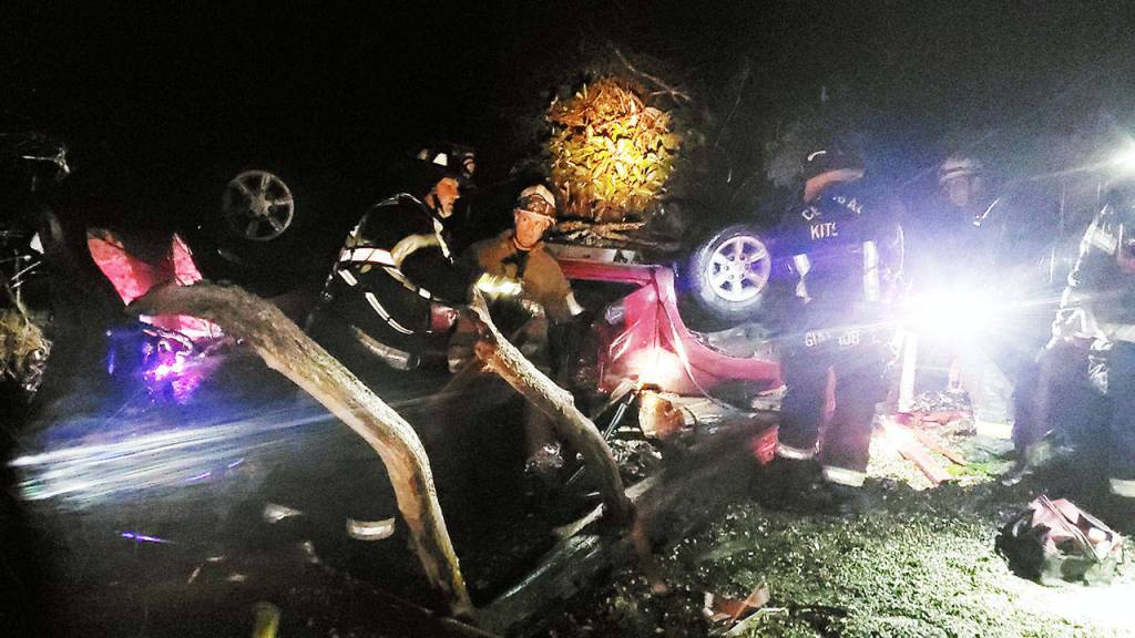 The crews from each of these agencies cut logs and trees away from the vehicle and used specialized equipment to stabilize it, as they pried the doors open to gain access to the occupants.