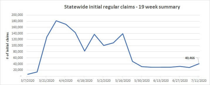 That increase mirrored statewide numbers, which saw a total of 40,466 initial regular unemployment claims in the same week, which was up 42.5 percent from the prior week. Total claims for all unemployment benefit categories were actually about 4.1 percent lower than the previous week.