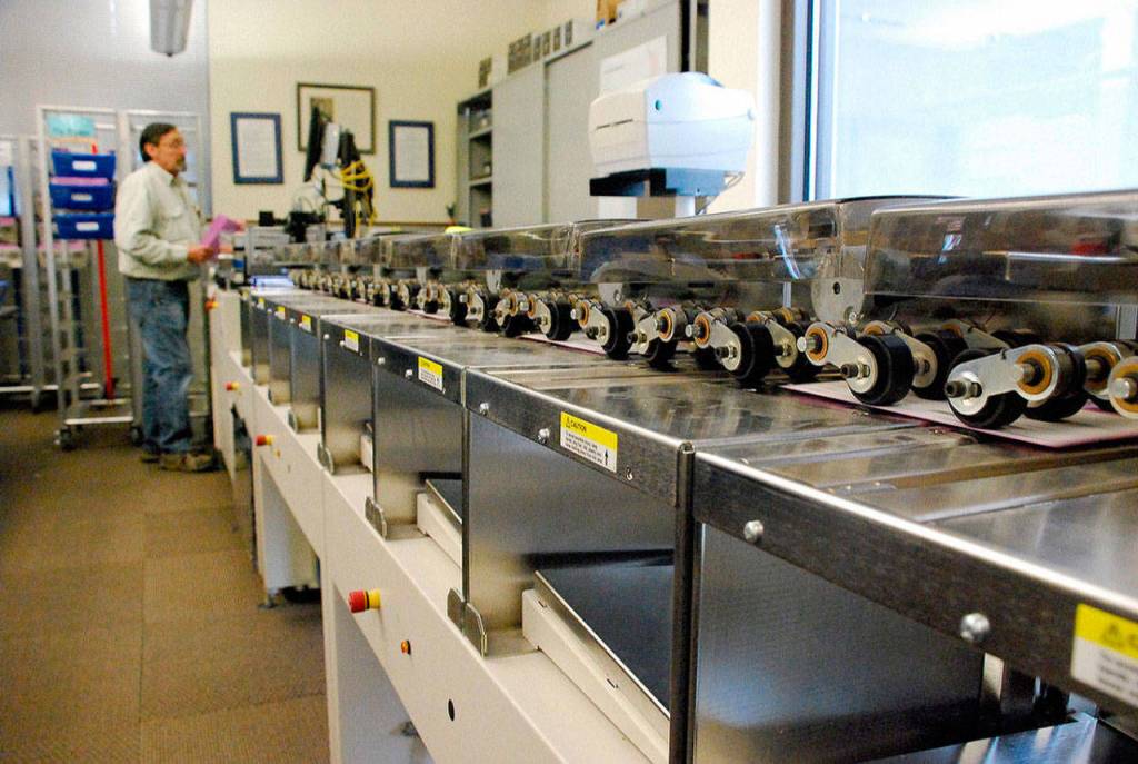 Harry Turnbull, extra help lead with the Kitsap County Elections Division, sends a batch of ballot envelopes through a processing reader prior to counting the ballots inside. (Bob Smith | Kitsap News Group 2018)