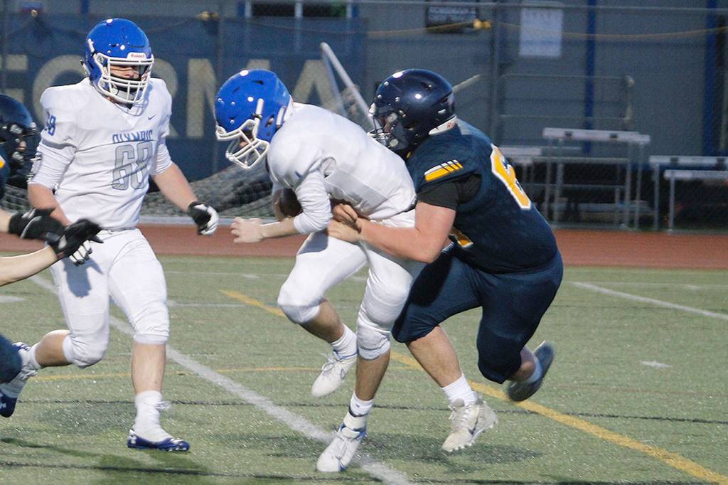 Feistner then opened the second half with an 87-yard kickoff return for a touchdown. It looked like the game could be a repeat of the previous week against Sequim, which dominated the line of scrimmage with a power running game. But the defense stiffened, allowing few big gains and first downs. The front seven was able to overcome Olympic’s talented offensive line.