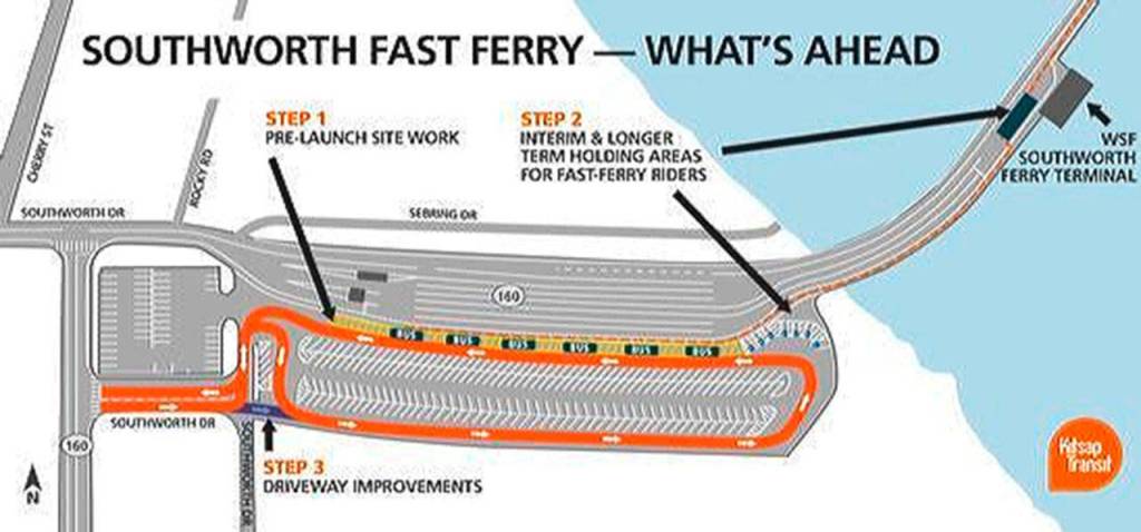 Next, Kitsap Transit and Washington State Ferries (WSF) will establish interim and longer-term passenger holding areas for the new Southworth Fast Ferry service, including a tent next to the WSF terminal building.