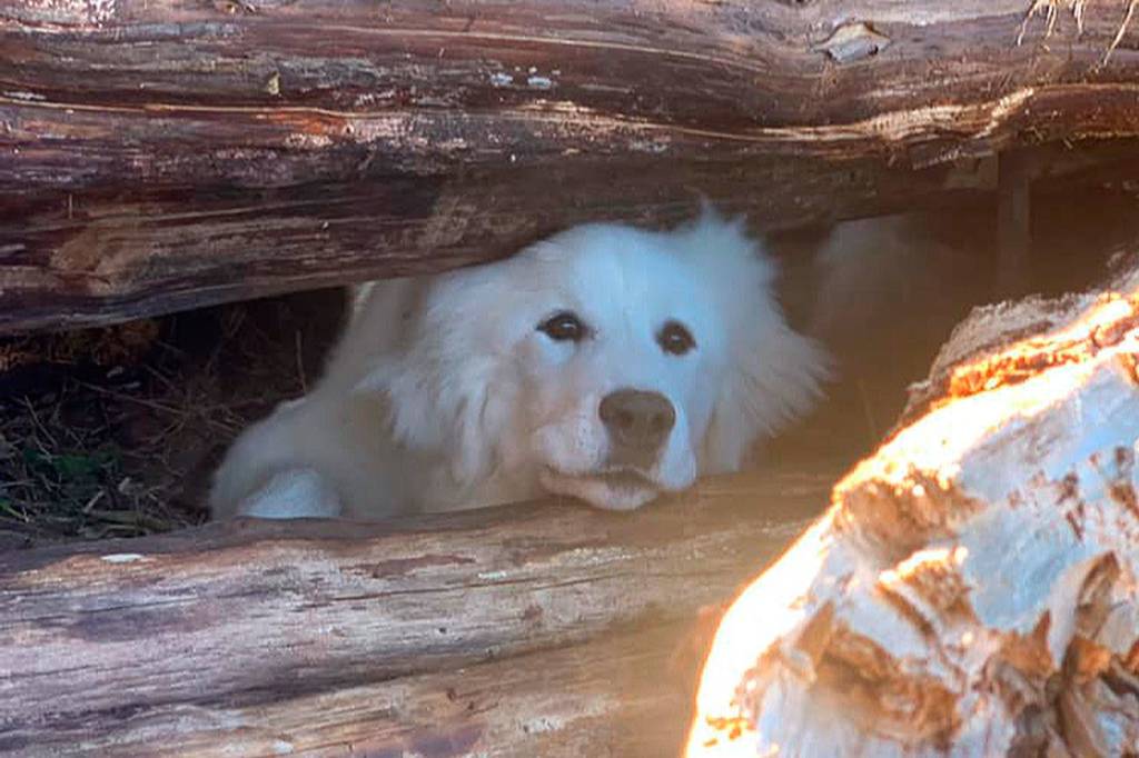 For example, take the case of Izzy, a curious Great Pyrenees out for her morning constitutional last week in South Kitsap. During a sunny session spent sniffing the scents of springtime, the snowy white canine followed a path less traveled, which led to a too-tight fix inside a cluster of logs in a woodpile.