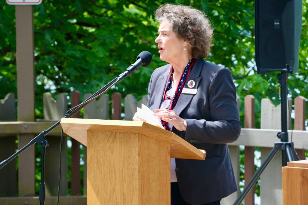 Poulsbo Mayor Becky Erickson spoke, recognizing its history and significance of the day, as well as noting that this was the first public ceremony she had spoken at in over a year because of COVID-19 pandemic restrictions.