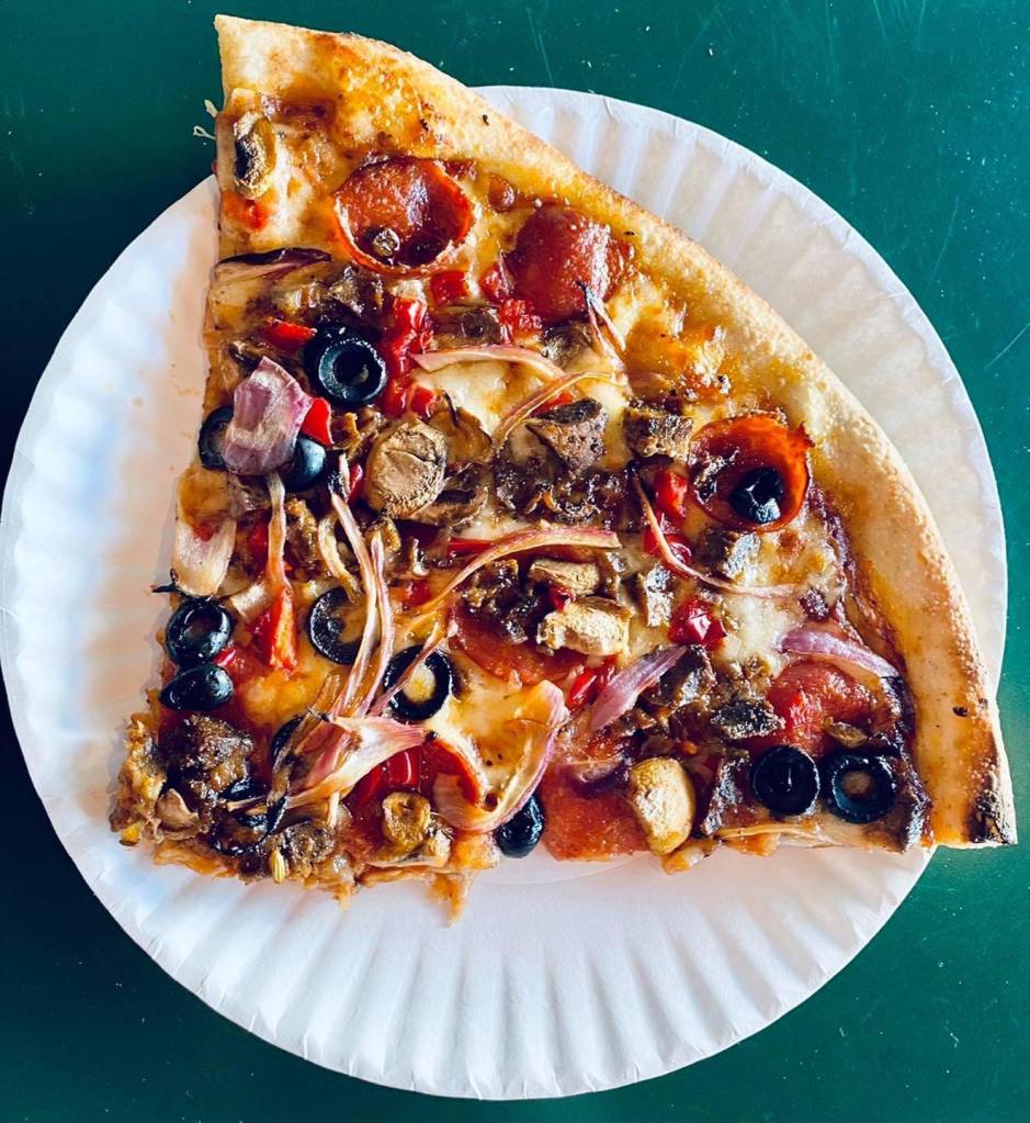 The pizzas are all New York style (read large slices) and made either with house-made dough or a gluten-free option. Customers can either order a 14-inch on either crust pie or just a slice of their favorite (house-made crust only) along with a side salad.