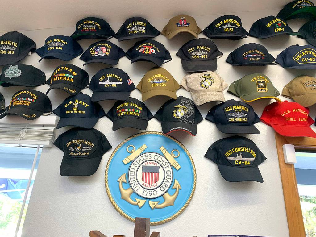 At the front of the barbershop building are brightly colored military flags waving in the wind — Army, Air Force, Marine Corps, Navy, Coast Guard and National Guard. Inside, military memorabilia provided by customers is showcased everywhere. A collection hats, or covers, decorate one section of the shop. An array of challenge coins that commemorate a boat or location where someone served, is also on display.