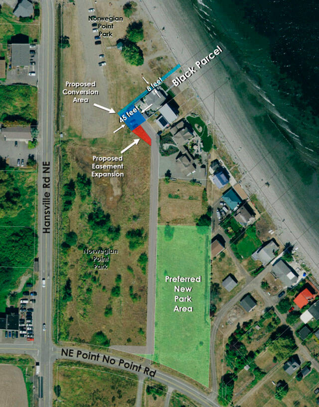 A county news release says in exchange for approximately 4,000 square feet and an easement of about 2,000 square feet, adjacent property owners have proposed transferring to Kitsap County approximately 1.3 acres to add to Norwegian Point Park.