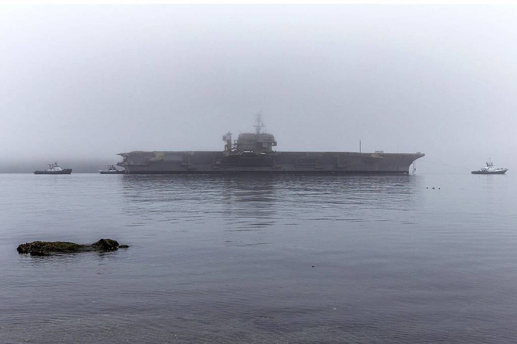 The U.S. Navy’s USS Kitty Hawk headed through the waters of Sinclair Inlet and Rich Passage Saturday — and into the mists of history as it departed its longtime portage in Bremerton to a Texas ship scrapyard.