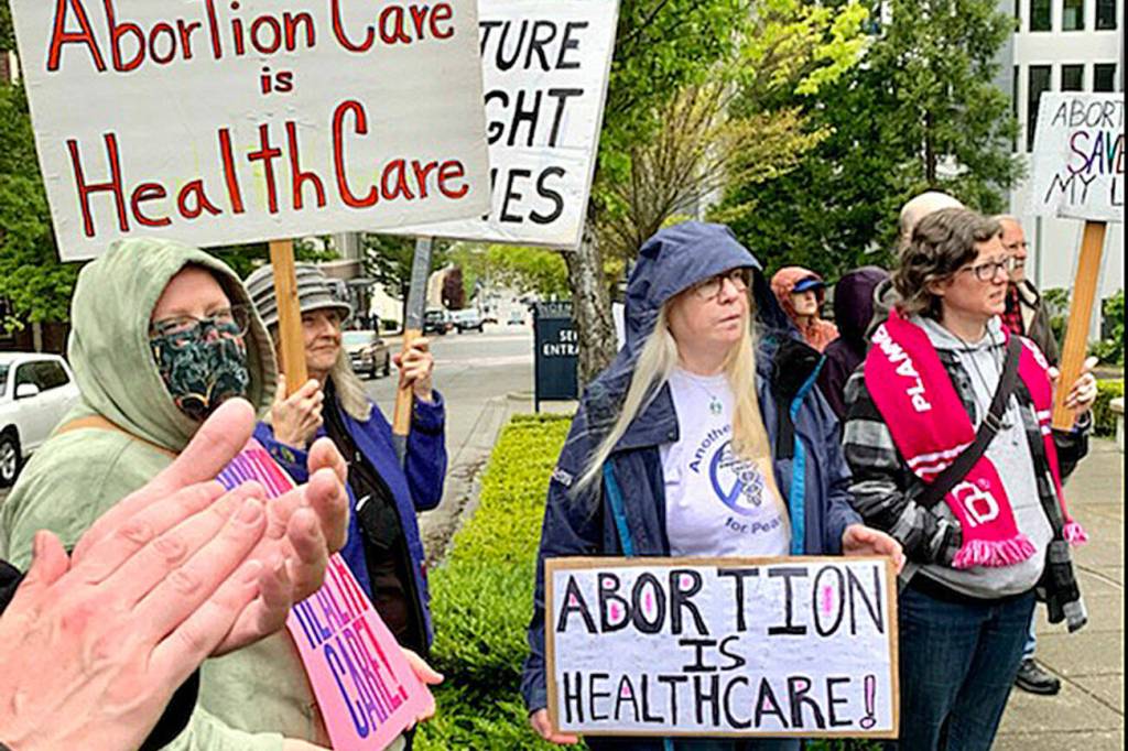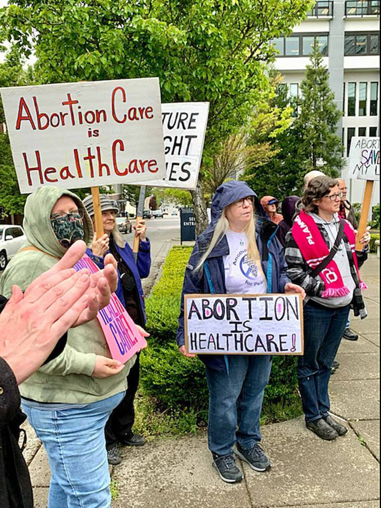 Frey shared her personal story with a crowd of about 100 people Friday afternoon in front of the Norm Dicks Government Center in Bremerton protesting the anticipated Supreme Court decision expected to come next month that is to reverse that monumental court case allowing women the choice to end their pregnancy.