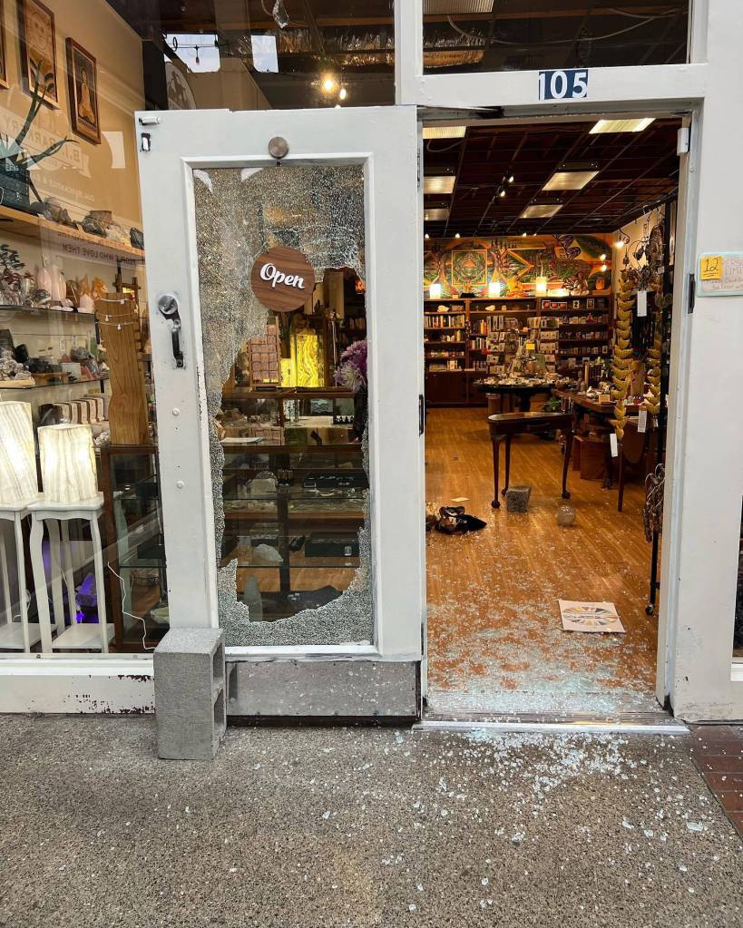 Jaynes does not yet know the total value of the stolen property, but described what was taken. “A lot of rings, most of our inventory and other locally made jewelry. As well as a few unique stones and of course cash.” She also found a Rutilated Quartz Sphere that had been thrown about 5 feet away from its location but was undamaged.