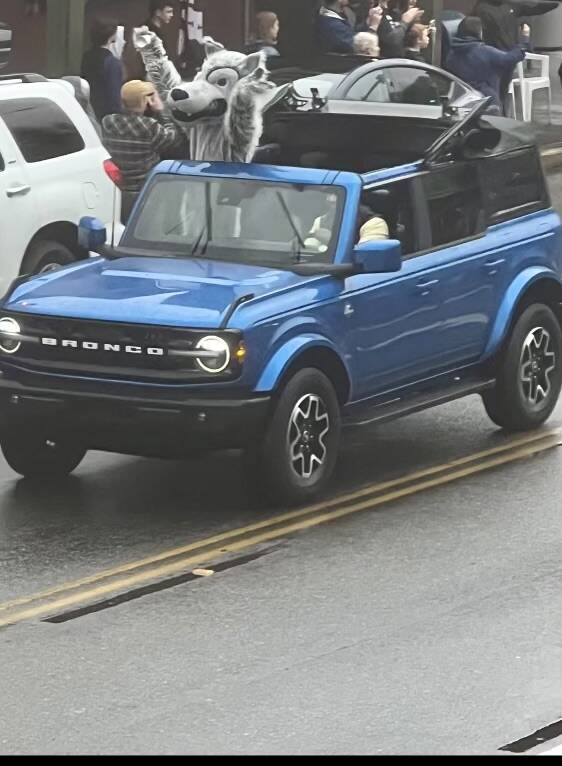 The South Kitsap mascot pumps up the crowd from the passenger seat.