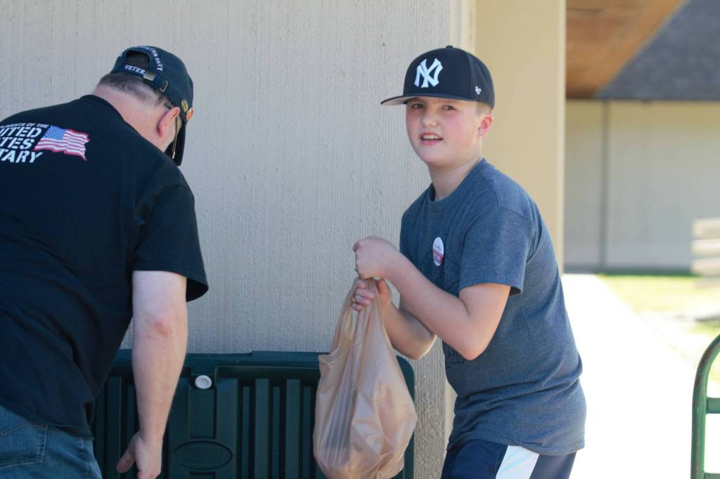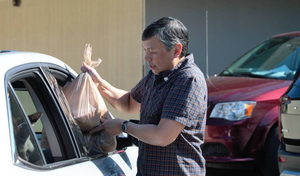 Sunnyslope Elementary counselor Roger Mangahas loads a meal for a veteran's family into the passenger side of the car. Elisha Meyer/Kitsap News Group Photos