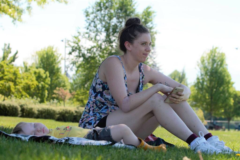 Emory Eller relaxes in the cool of the shade at Lions Park with her son Clarence, who is fast asleep. Elisha Meyer/Kitsap News Group