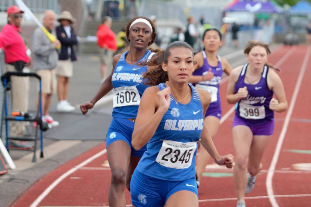 Senior sprinter from Olympic High School N’Dya Hudson (back) approaches her senior teammate Aalliya Alcorn (front) for a baton handoff in the 4x200-meter relay.