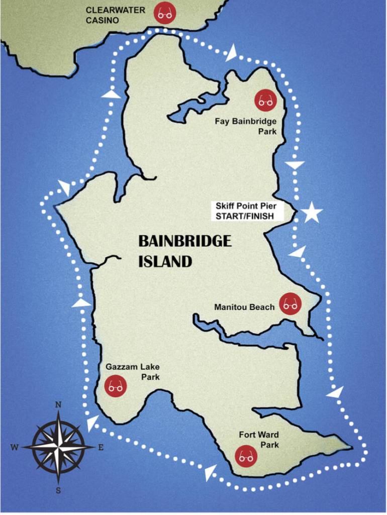 She will be pacing for 12 hours around the southern tip of BI, through Rich Passage, through the channel between BI and the Kitsap Peninsula, underneath Agate Pass bridge and finish back at Skiff Point.