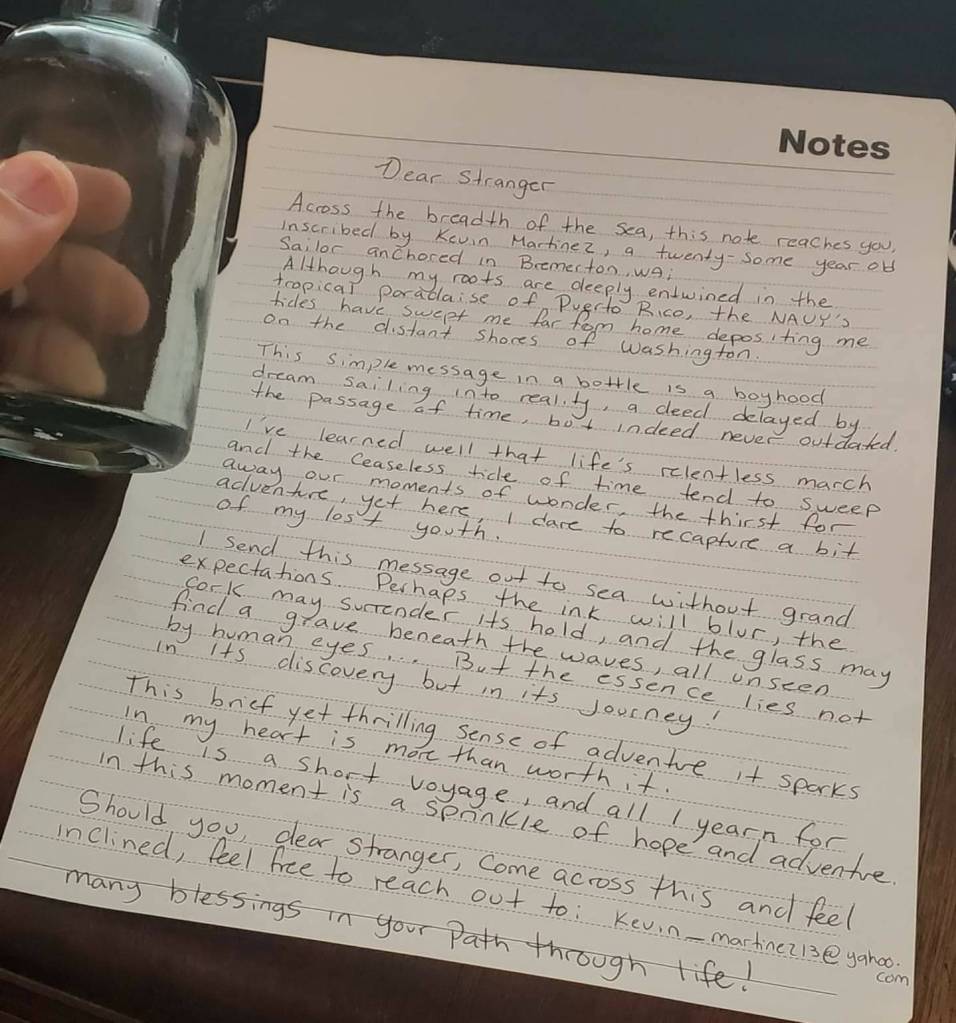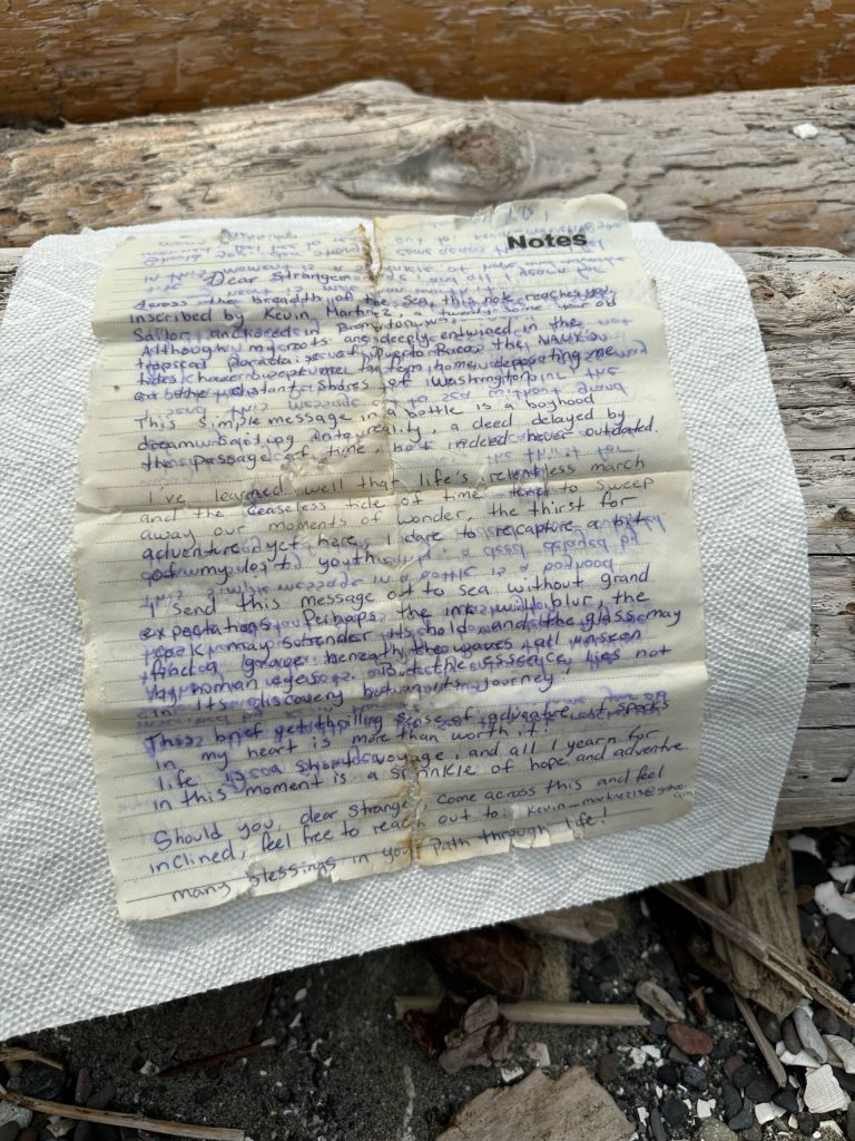 About six weeks after releasing the bottle, Martinez received an email from a mother and son who found it at Lopez Beach, British Columbia. “I was incredulous,” Martinez said. “It was a beautiful message that made me nearly tear up. I can relate because I wanted to do it as a kid and for a kid to find it, it goes full circle.”