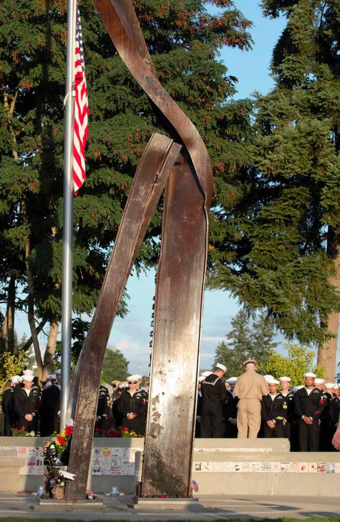Flowers are placed at the base of the steel beams of the Kitsap 9/11 Memorial in Silverdale.