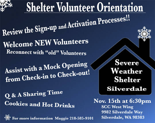 When the shelter is open, two volunteers are needed for each of the three 5-hour shifts. If you think you might be interested come to an orientation Nov. 15 at 6:30 p.m. at 9982 Silverdale Way NW. The shelter season runs from Nov. 1 though March 31. “While it’s not for everyone,” shelter manager Maggie Stasny said, “you’ll never know if this is your passion unless you try.”