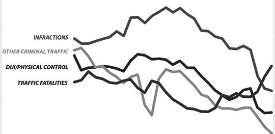 A: You’re asking a great question, but I don’t think you went big enough. It’s hard to spot a trend in a three-to-five-year window. So I went bigger. Let’s take a look at the last 20 years of traffic fatalities and traffic enforcement.